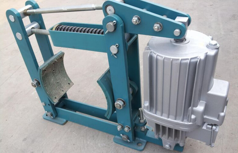 在接通電源時,電磁松閘器的鐵心吸引銜鐵壓向推桿,推桿推動左制動臂向左擺,主彈簧被壓縮。同時,解除壓力的輔助彈簧將右制動臂向右推,兩制動臂帶動制動瓦塊與制動輪分離,機構可以運動。當切斷電源時,鐵心失去磁性,對銜鐵的吸引力消除,因而解除銜鐵對推桿的壓力,在主彈簧張力的作用下,兩制動臂一起向內收擺,帶動制動瓦塊抱緊制動輪產生制動力矩;同時,輔助彈簧被壓縮。制動力矩由主彈簧力決定,輔助彈簧保證松間間隙。塊式制動器的制動性能在很大程度上是由松閘器的性能決定的。