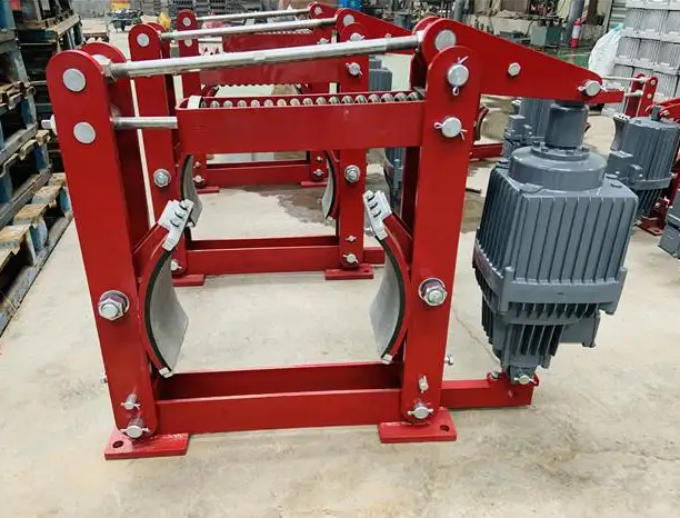 起重機起升機構中多用長行程電磁鐵制動器或液壓電磁鐵制動器,在運行機構中多用短行程電磁鐵制動器或液壓推桿制動器。 這幾種制動器是靠主彈簧的做用力,通過制動臂使制動帶對稱地抱在制動輪上。制動帶與制動輪的接觸面積不應小于制動帶面積的75%。各種制動器上的尺寸是主彈簧在正常情況下能發出額定制動力矩的長度。