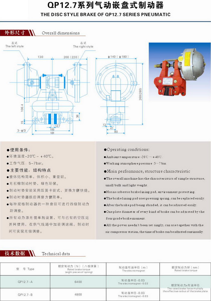 氣動鉗盤制動器QP12.7,CQP12.7,QPL12.7,QP20,QP250,QP30等型號,性能安全可靠,制動平穩,使用壽命長。